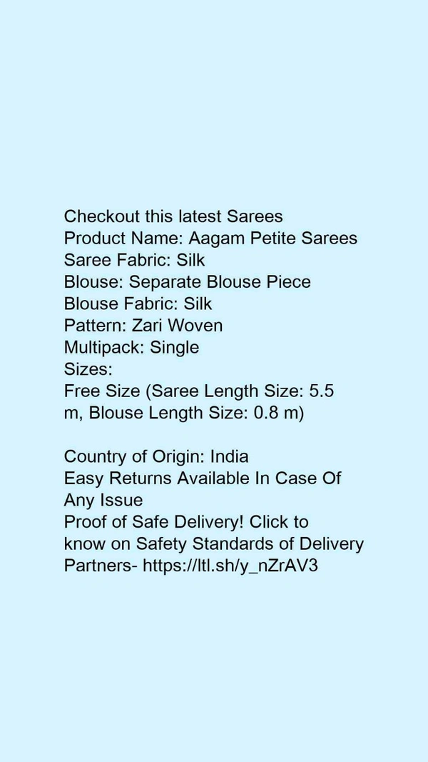 Product Name: *Aagam Petite Sarees*Saree Fabric: SilkBlouse: Separate Blouse PieceBlouse Fabric: SilkPattern: Zari WovenMultipack: Single
