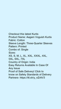 Product Name: *Aagam Voguish Kurtis*Fabric: CottonSleeve Length: Three-Quarter SleevesPattern: PrintedCombo of: Single
