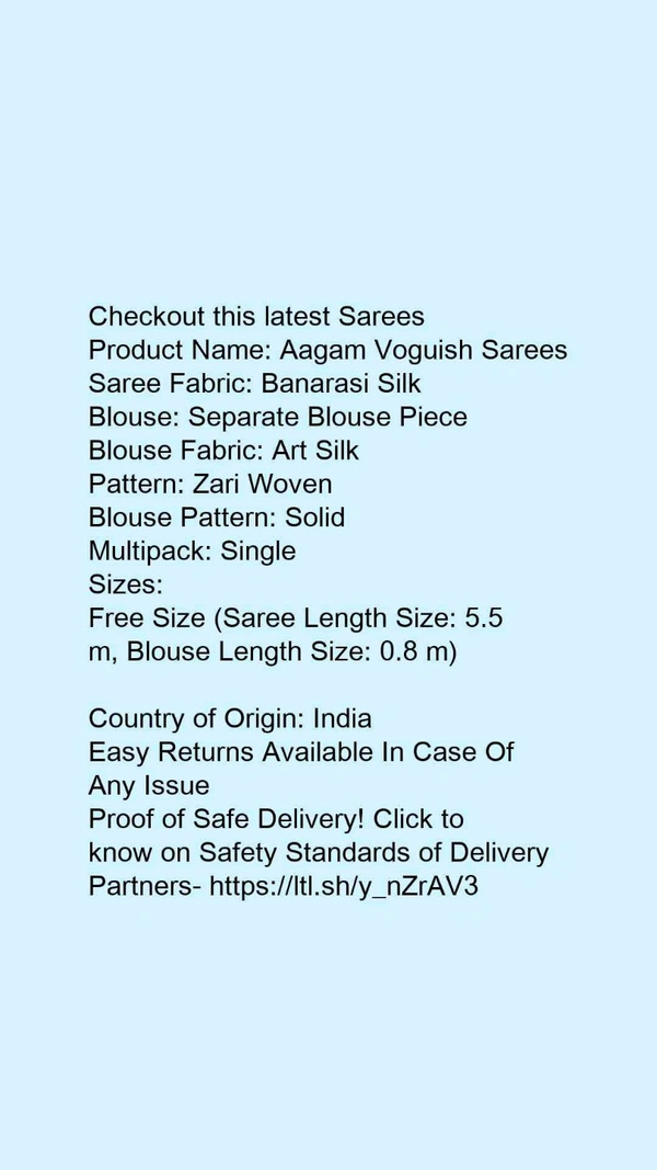 Product Name: *Aagam Voguish Sarees*Saree Fabric: Banarasi SilkBlouse: Separate Blouse PieceBlouse Fabric: Art SilkPattern: Zari WovenBlouse Pattern: SolidMultipack: Single
