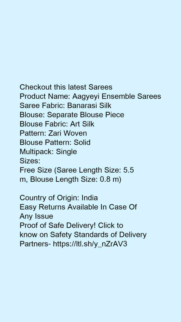 Product Name: *Aagyeyi Ensemble Sarees*Saree Fabric: Banarasi SilkBlouse: Separate Blouse PieceBlouse Fabric: Art SilkPattern: Zari WovenBlouse Pattern: SolidMultipack: Single