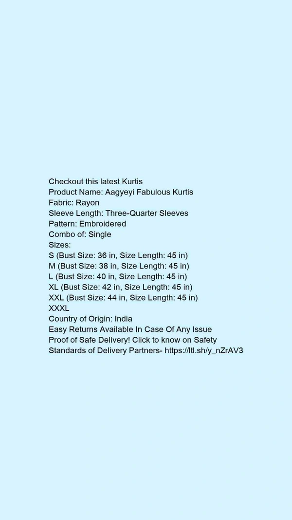 Product Name: *Aagyeyi Fabulous Kurtis*Fabric: RayonSleeve Length: Three-Quarter SleevesPattern: EmbroideredCombo of: Single