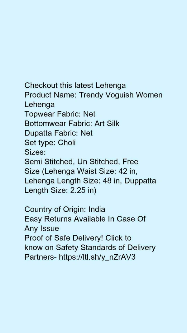 Product Name: *Aagyeyi Fabulous Women Lehenga*Topwear Fabric: NetBottomwear Fabric: Art SilkDupatta Fabric: NetSet type: Choli