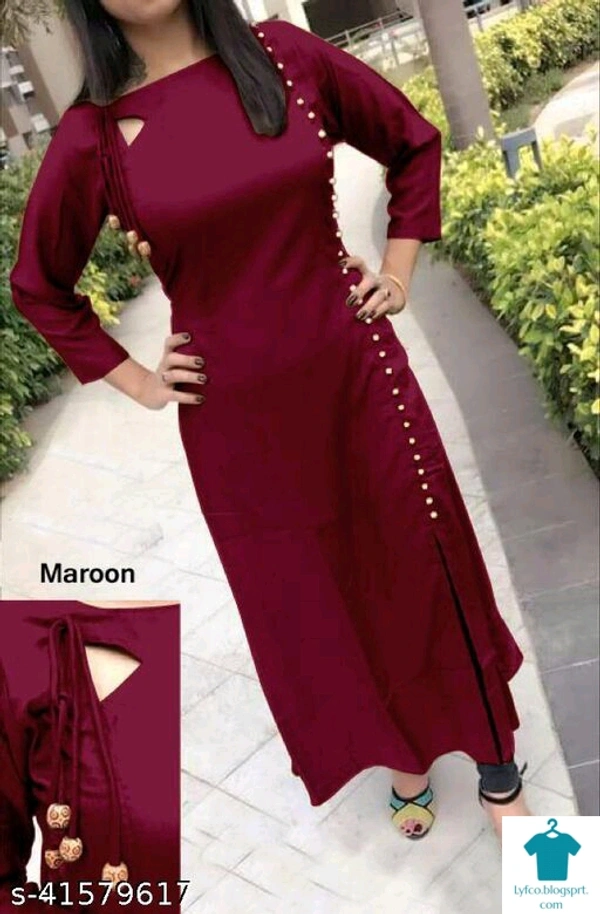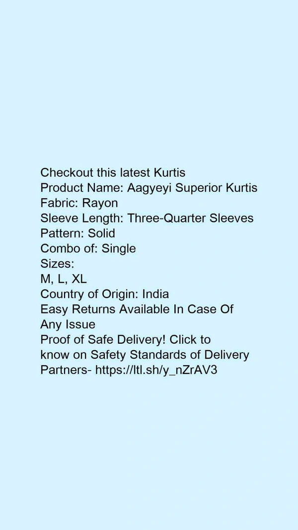 Product Name: *Aagyeyi Superior Kurtis*Fabric: RayonSleeve Length: Three-Quarter SleevesPattern: SolidCombo of: Single