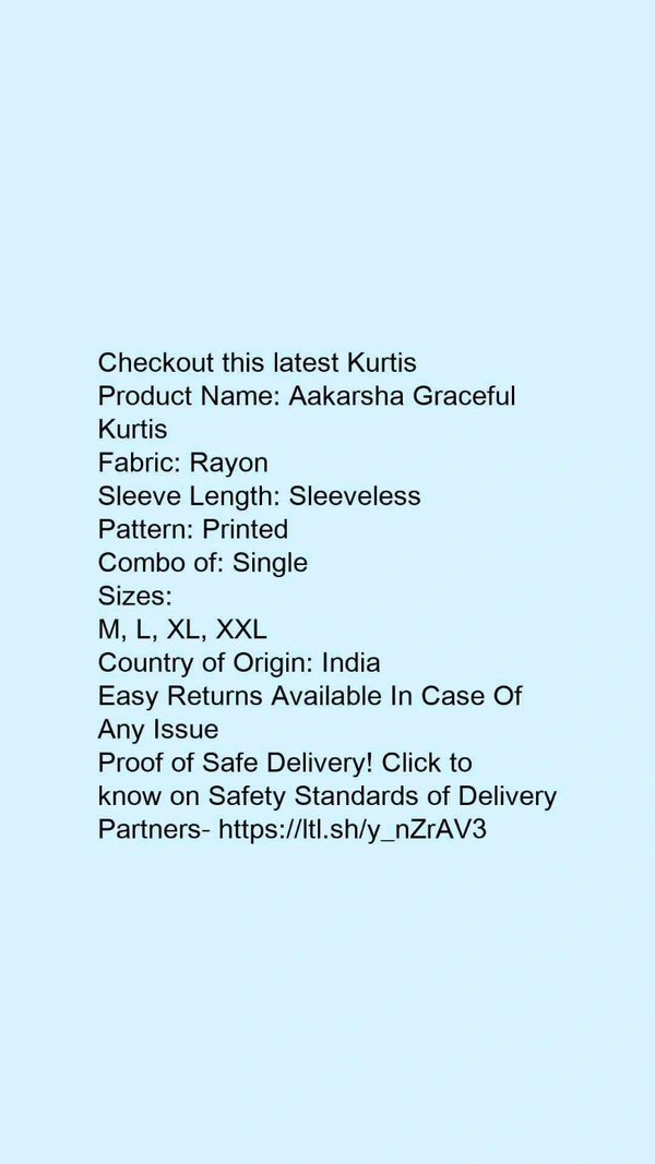 Product Name: *Aakarsha Graceful Kurtis*Fabric: RayonSleeve Length: SleevelessPattern: PrintedCombo of: Single