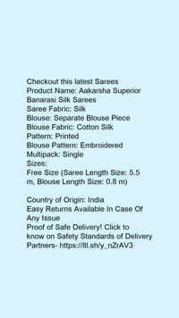 Product Name: *Aakarsha Superior Banarasi Silk Sarees*Saree Fabric: SilkBlouse: Separate Blouse PieceBlouse Fabric: Cotton SilkPattern: PrintedBlouse Pattern: EmbroideredMultipack: Single