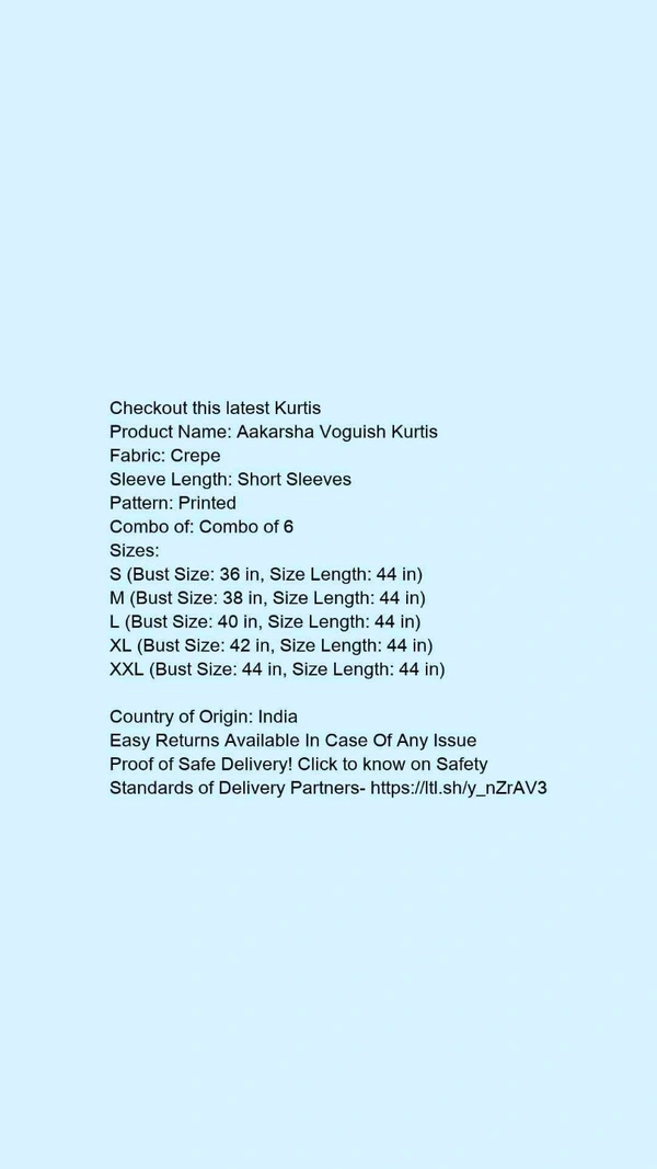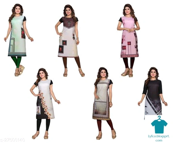 Product Name: *Aakarsha Voguish Kurtis*Fabric: CrepeSleeve Length: Short SleevesPattern: PrintedCombo of: Combo of 6