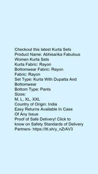 Product Name: *Abhisarika Fabulous Women Kurta Sets*Kurta Fabric: RayonBottomwear Fabric: RayonFabric: RayonSet Type: Kurta With Dupatta And BottomwearBottom Type: Pants
