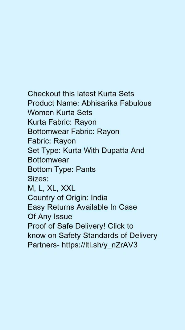 Product Name: *Abhisarika Fabulous Women Kurta Sets*Kurta Fabric: RayonBottomwear Fabric: RayonFabric: RayonSet Type: Kurta With Dupatta And BottomwearBottom Type: Pants