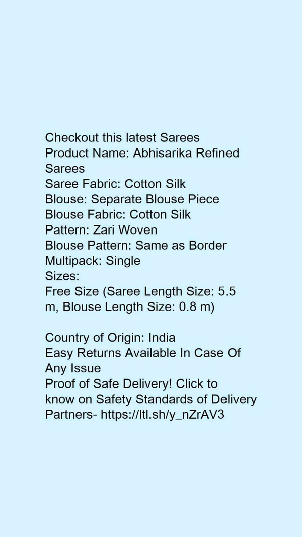 Product Name: *Abhisarika Refined Sarees*Saree Fabric: Cotton SilkBlouse: Separate Blouse PieceBlouse Fabric: Cotton SilkPattern: Zari WovenBlouse Pattern: Same as BorderMultipack: Single