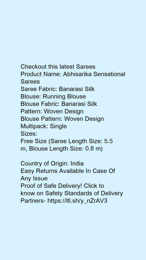 Product Name: *Abhisarika Sensational Sarees*Saree Fabric: Banarasi SilkBlouse: Running BlouseBlouse Fabric: Banarasi SilkPattern: Woven DesignBlouse Pattern: Woven DesignMultipack: Single