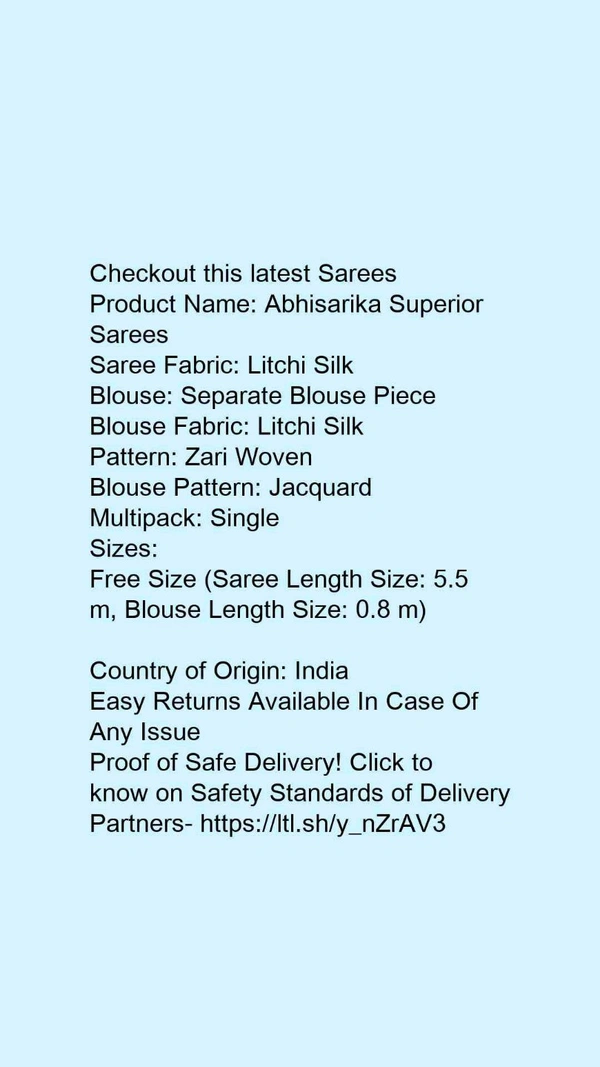 Product Name: *Abhisarika Superior Sarees*Saree Fabric: Litchi SilkBlouse: Separate Blouse PieceBlouse Fabric: Litchi SilkPattern: Zari WovenBlouse Pattern: JacquardMultipack: Single