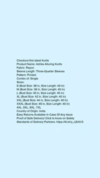 Product Name: *Adrika Alluring Kurtis*Fabric: RayonSleeve Length: Three-Quarter SleevesPattern: PrintedCombo of: Single