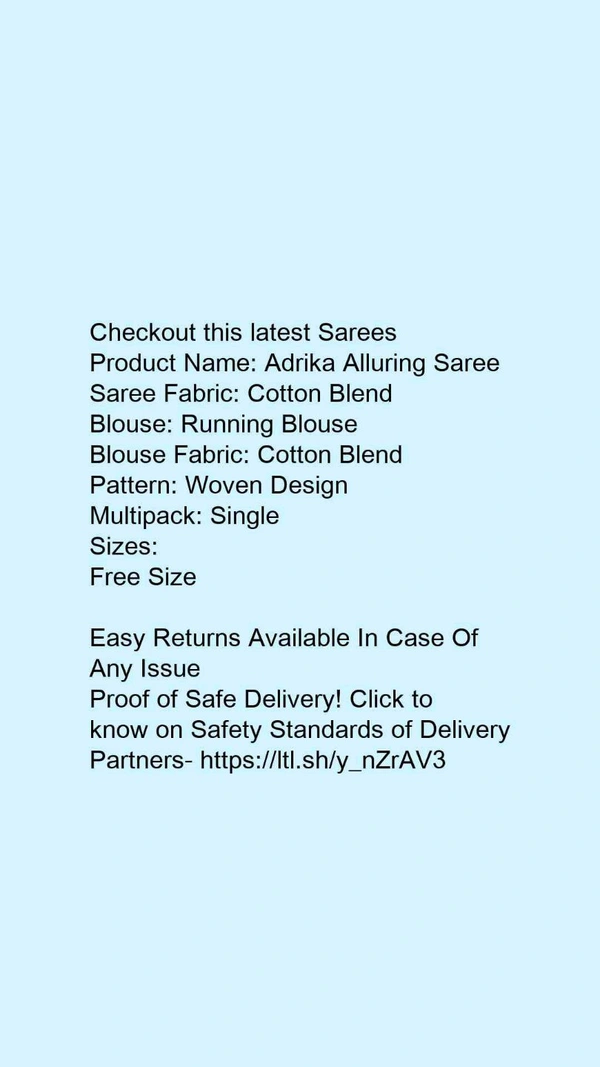 Product Name: *Adrika Alluring Saree*Saree Fabric: Cotton BlendBlouse: Running BlouseBlouse Fabric: Cotton BlendPattern: Woven DesignMultipack: Single