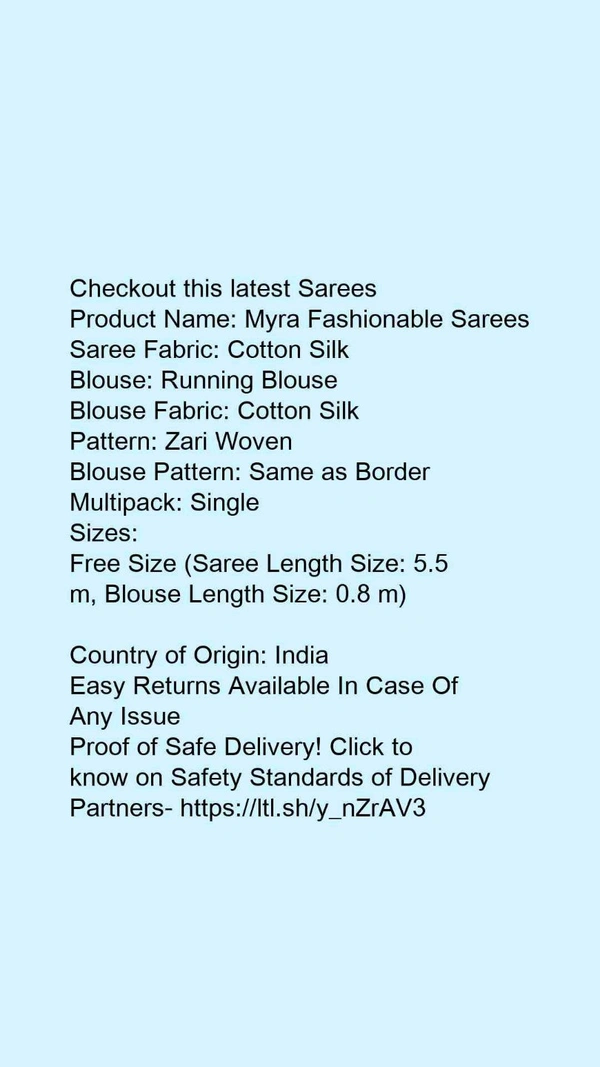 Product Name: *Adrika Attractive Sarees*Saree Fabric: Cotton SilkBlouse: Running BlouseBlouse Fabric: Cotton SilkPattern: Zari WovenBlouse Pattern: Same as BorderMultipack: Single
