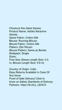 Product Name: *Adrika Attractive Sarees*Saree Fabric: Cotton SilkBlouse: Running BlouseBlouse Fabric: Cotton SilkPattern: Zari WovenBlouse Pattern: Same as BorderMultipack: Single