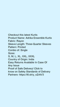 Product Name: *Adrika Ensemble Kurtis*Fabric: RayonSleeve Length: Three-Quarter SleevesPattern: PrintedCombo of: Single