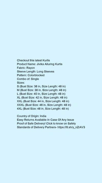 Product Name: *Adrika Petite Kurtis*Fabric: RayonSleeve Length: Long SleevesPattern: ColorblockedCombo of: Single