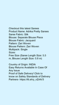 Product Name: *Adrika Pretty Sarees*Saree Fabric: SilkBlouse: Separate Blouse PieceBlouse Fabric: JacquardPattern: Zari WovenBlouse Pattern: Zari WovenMultipack: Single