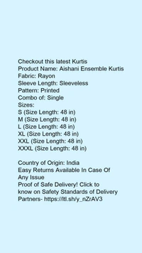 Product Name: *Aishani Ensemble Kurtis*Fabric: RayonSleeve Length: SleevelessPattern: PrintedCombo of: Single