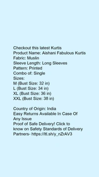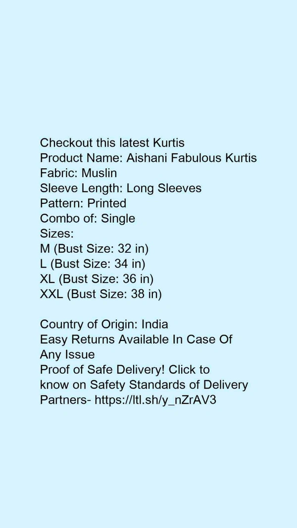 Product Name: *Aishani Fabulous Kurtis*Fabric: MuslinSleeve Length: Long SleevesPattern: PrintedCombo of: Single