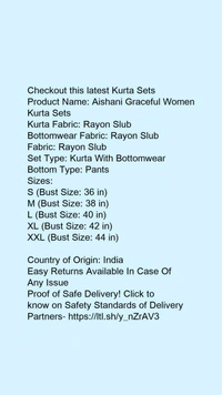 Product Name: *Aishani Graceful Women Kurta Sets*Kurta Fabric: Rayon SlubBottomwear Fabric: Rayon SlubFabric: Rayon SlubSet Type: Kurta With BottomwearBottom Type: Pants
