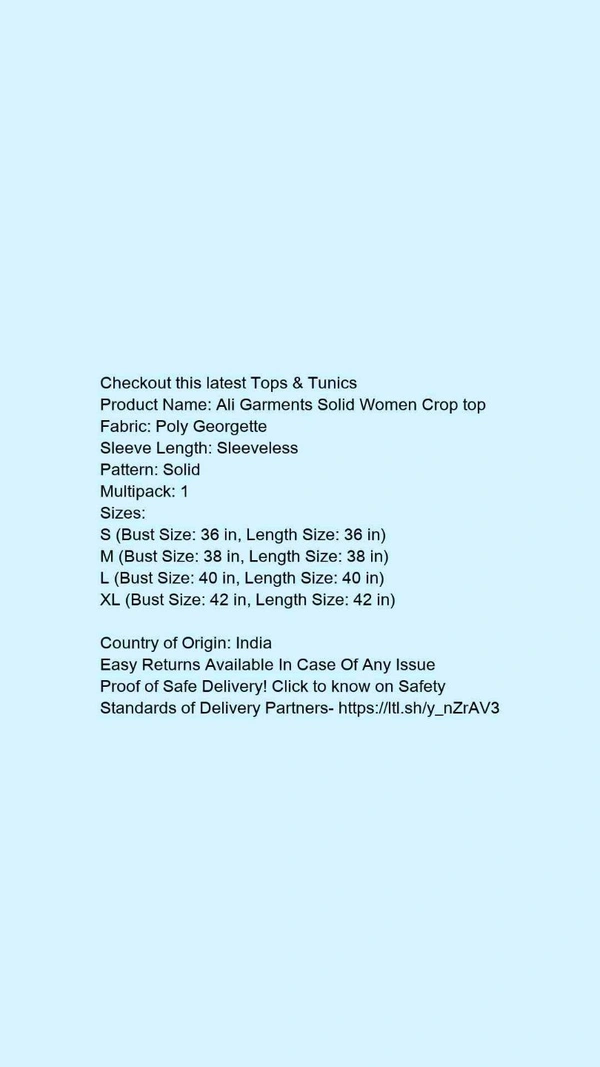 Product Name: *Ali Garments Solid Women Crop top*Fabric: Poly GeorgetteSleeve Length: SleevelessPattern: SolidMultipack: 1