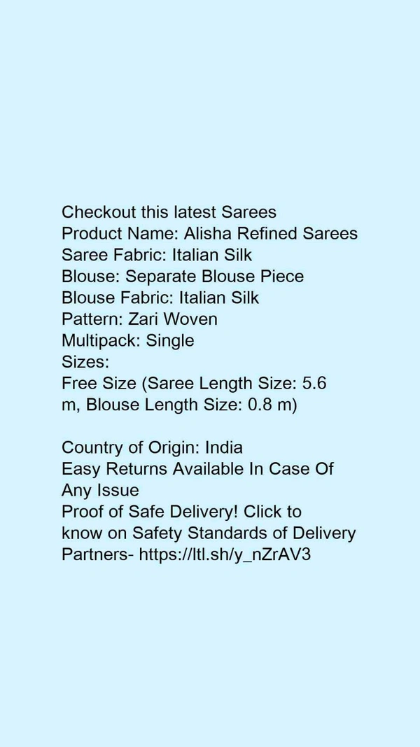 Product Name: *Alisha Refined Sarees*Saree Fabric: Italian SilkBlouse: Separate Blouse PieceBlouse Fabric: Italian SilkPattern: Zari WovenMultipack: Single