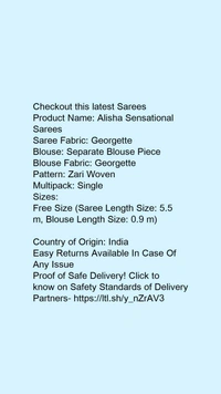 Product Name: *Alisha Sensational Sarees*Saree Fabric: GeorgetteBlouse: Separate Blouse PieceBlouse Fabric: GeorgettePattern: Zari WovenMultipack: Single