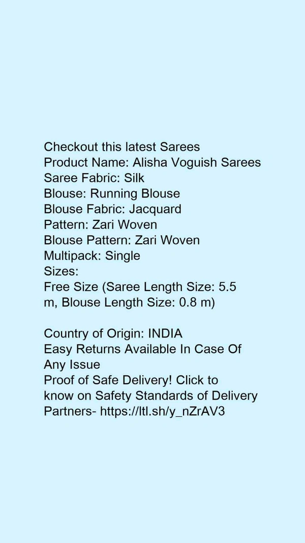 Product Name: *Alisha Voguish Sarees*Saree Fabric: SilkBlouse: Running BlouseBlouse Fabric: JacquardPattern: Zari WovenBlouse Pattern: Zari WovenMultipack: Single