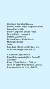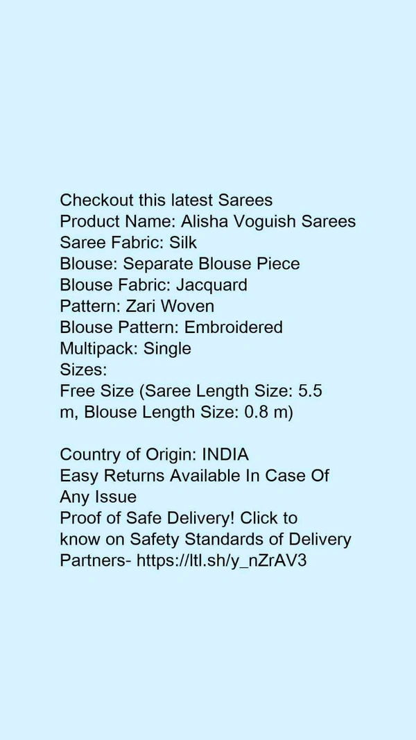 Product Name: *Alisha Voguish Sarees*Saree Fabric: SilkBlouse: Separate Blouse PieceBlouse Fabric: JacquardPattern: Zari WovenBlouse Pattern: EmbroideredMultipack: Single