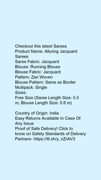 Product Name: *Alluring Jacquard Sarees*Saree Fabric: JacquardBlouse: Running BlouseBlouse Fabric: JacquardPattern: Zari WovenBlouse Pattern: Same as BorderMultipack: Single