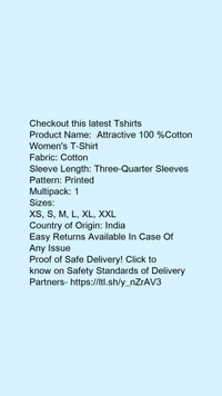 Product Name: * Attractive 100 %Cotton Women's T-Shirt*Fabric: CottonSleeve Length: Three-Quarter SleevesPattern: PrintedMultipack: 1