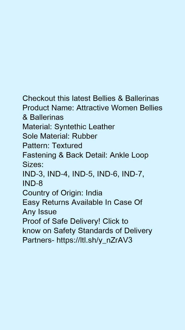 Product Name: *Attractive Women Bellies & Ballerinas*Material: Syntethic LeatherSole Material: RubberPattern: TexturedFastening & Back Detail: Ankle Loop