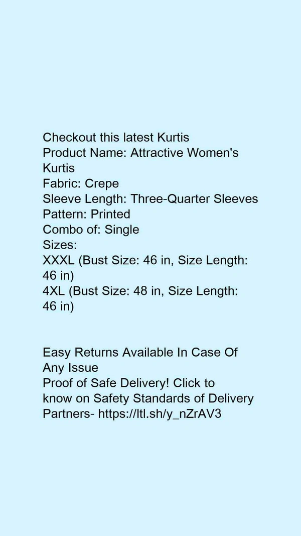 Product Name: *Attractive Women's Kurtis*Fabric: CrepeSleeve Length: Three-Quarter SleevesPattern: PrintedCombo of: Single
