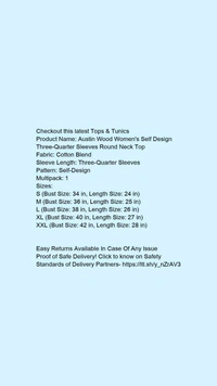 Product Name: *Austin Wood Women's Self Design Three-Quarter Sleeves Round Neck Top*Fabric: Cotton BlendSleeve Length: Three-Quarter SleevesPattern: Self-DesignMultipack: 1