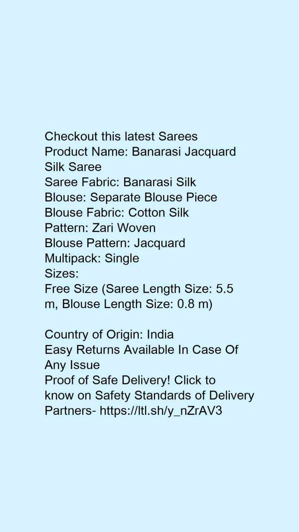 Product Name: *Banarasi Jacquard Silk Saree*Saree Fabric: Banarasi SilkBlouse: Separate Blouse PieceBlouse Fabric: Cotton SilkPattern: Zari WovenBlouse Pattern: JacquardMultipack: Single