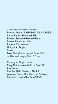Product Name: *BANARASI SILK SAREE*Saree Fabric: Banarasi SilkBlouse: Separate Blouse PieceBlouse Fabric: Art SilkPattern: Zari WovenMultipack: Single