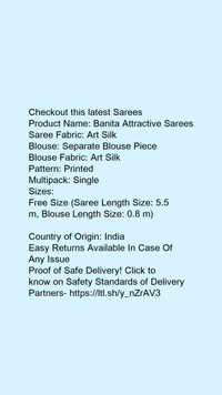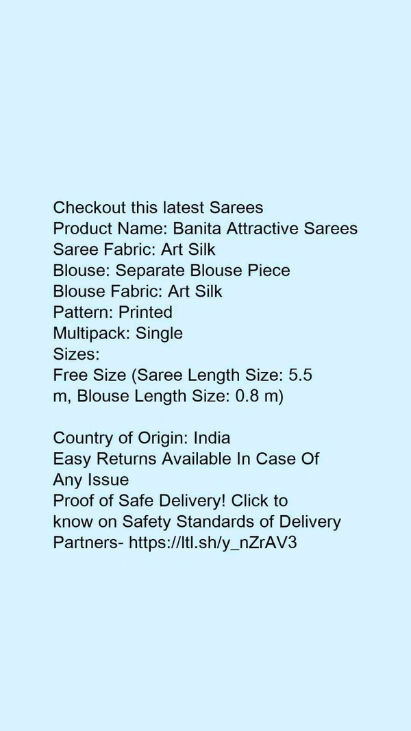 Product Name: *Banita Attractive Sarees*Saree Fabric: Art SilkBlouse: Separate Blouse PieceBlouse Fabric: Art SilkPattern: PrintedMultipack: SingleSizes: Free Size (Saree Length Size: 5.5 m, Blouse Length Size: 0.8 m)