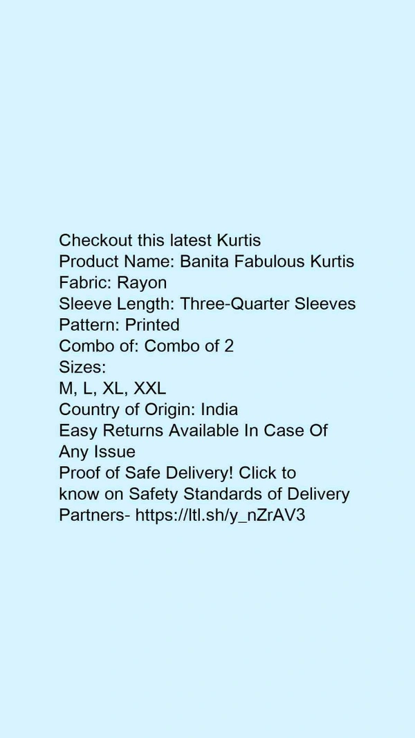 Product Name: *Banita Fabulous Kurtis*Fabric: RayonSleeve Length: Three-Quarter SleevesPattern: PrintedCombo of: Combo of 2