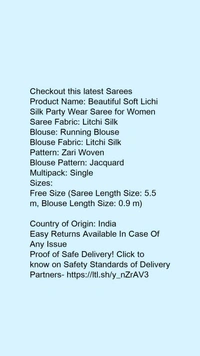 Product Name: *Beautiful Soft Lichi Silk Party Wear Saree for Women*Saree Fabric: Litchi SilkBlouse: Running BlouseBlouse Fabric: Litchi SilkPattern: Zari WovenBlouse Pattern: JacquardMultipack: Single