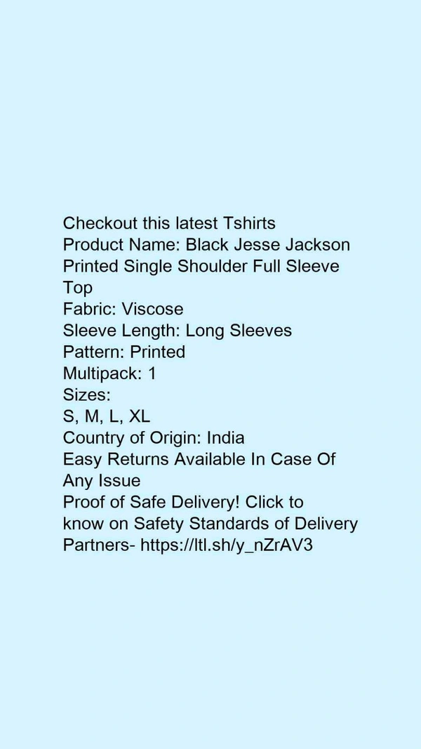 Product Name: *Black Jesse Jackson Printed Single Shoulder Full Sleeve Top*Fabric: ViscoseSleeve Length: Long SleevesPattern: PrintedMultipack: 1