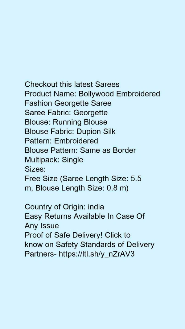 Product Name: *Bollywood Embroidered Fashion Georgette Saree*Saree Fabric: GeorgetteBlouse: Running BlouseBlouse Fabric: Dupion SilkPattern: EmbroideredBlouse Pattern: Same as BorderMultipack: Single