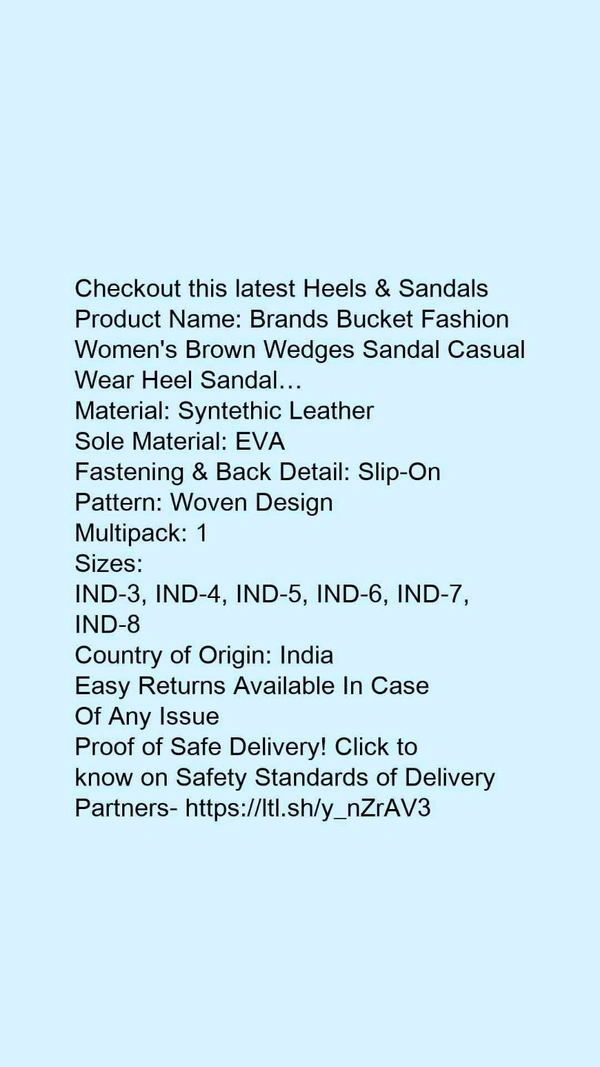 Product Name: *Brands Bucket Fashion Women's Brown Wedges Sandal Casual Wear Heel Sandal…*Material: Syntethic LeatherSole Material: EVAFastening & Back Detail: Slip-OnPattern: Woven DesignMultipack: 1