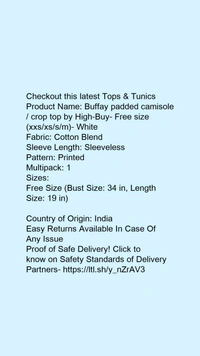 Product Name: *Buffay padded camisole / crop top by High-Buy- Free size (xxs/xs/s/m)- White*Fabric: Cotton BlendSleeve Length: SleevelessPattern: PrintedMultipack: 1