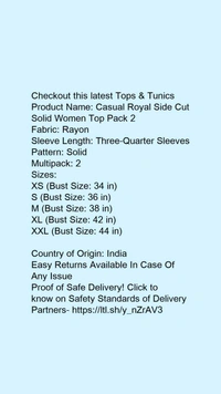 Product Name: *Casual Royal Side Cut Solid Women Top Pack 2*Fabric: RayonSleeve Length: Three-Quarter SleevesPattern: SolidMultipack: 2