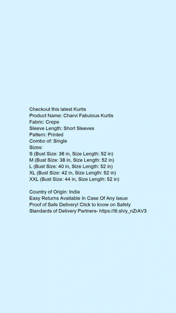 Product Name: *Charvi Fabulous Kurtis*Fabric: CrepeSleeve Length: Short SleevesPattern: PrintedCombo of: Single