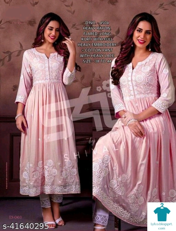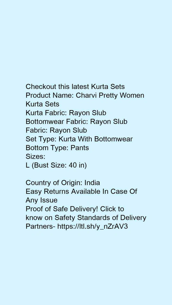 Product Name: *Charvi Pretty Women Kurta Sets*Kurta Fabric: Rayon SlubBottomwear Fabric: Rayon SlubFabric: Rayon SlubSet Type: Kurta With BottomwearBottom Type: Pants