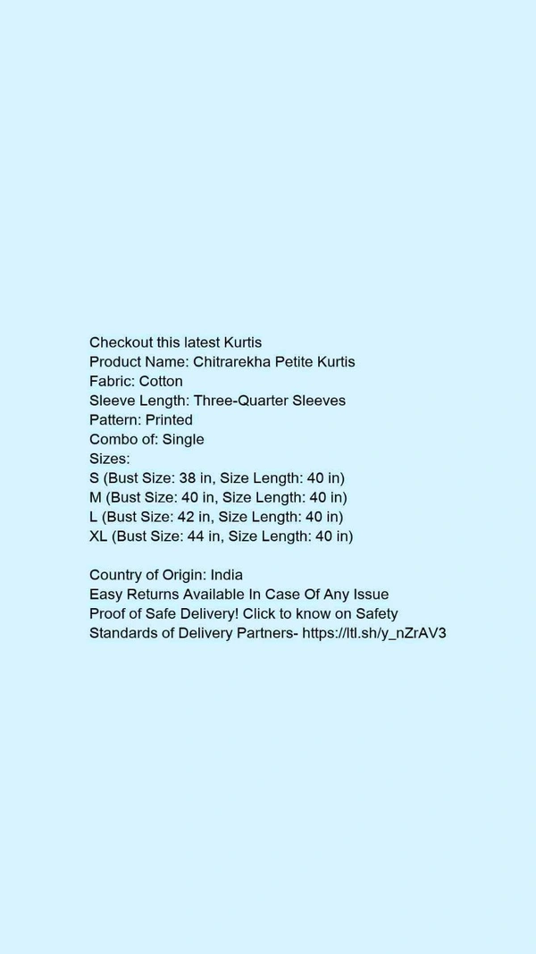 Product Name: *Chitrarekha Petite Kurtis*Fabric: CottonSleeve Length: Three-Quarter SleevesPattern: PrintedCombo of: Single