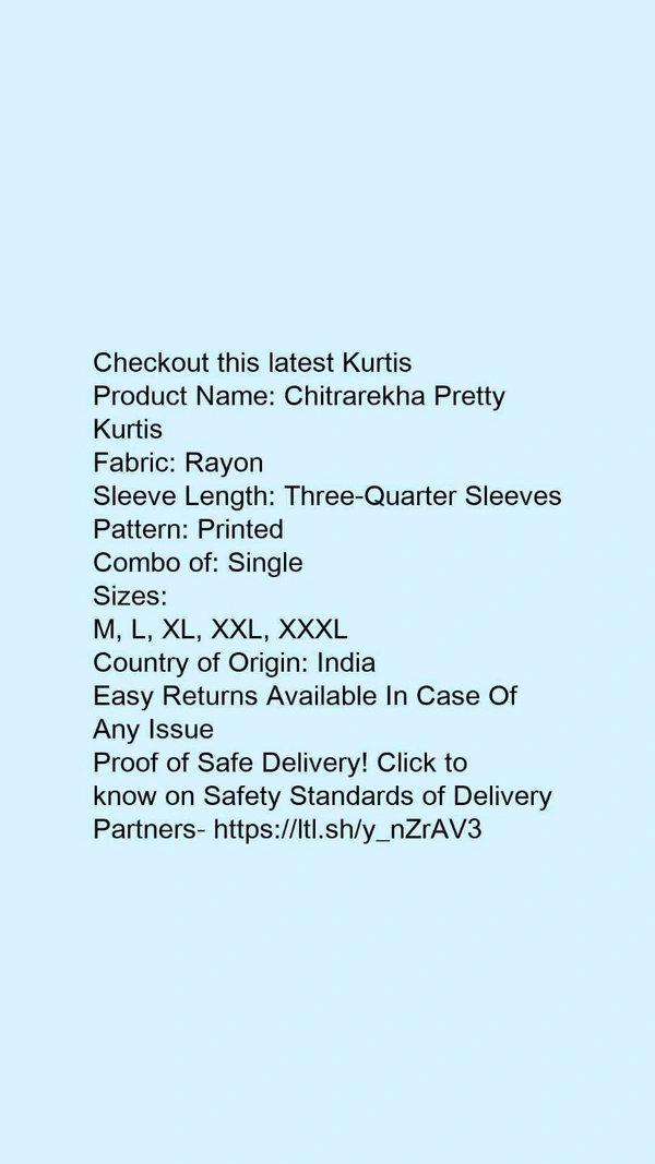 Product Name: *Chitrarekha Pretty Kurtis*Fabric: RayonSleeve Length: Three-Quarter SleevesPattern: PrintedCombo of: Single