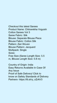 Product Name: *Chitrarekha Voguish Cotton Sarees Vol 3*Saree Fabric: SilkBlouse: Separate Blouse PieceBlouse Fabric: Cotton SilkPattern: Zari WovenBlouse Pattern: JacquardMultipack: Single